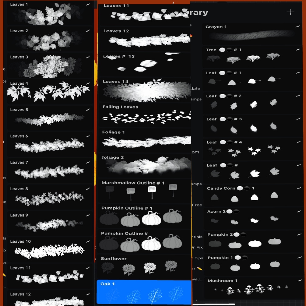 •  12 Unique Leaf Brushes/Stamps: From scattered falling leaves to detailed foliage designs, perfect for backgrounds and overlays.
