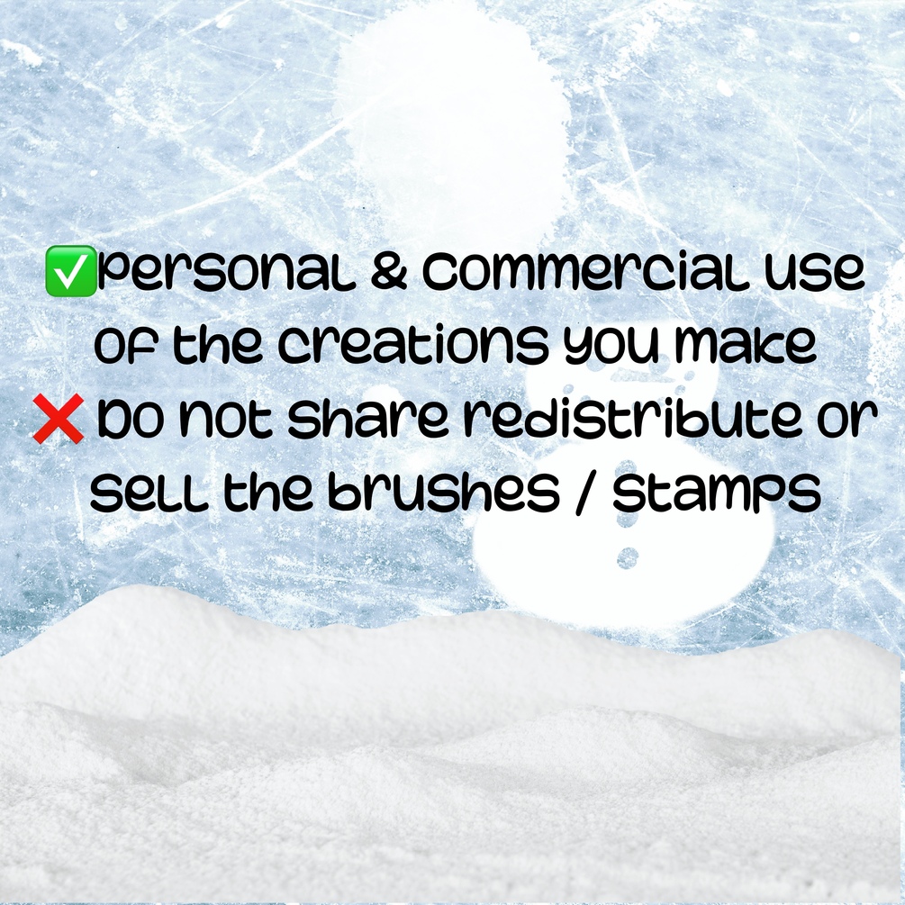 * 26 Hand drawn Snowflake stamp brushes (versatility with spacing) • 8 Snow FX Brushes: Add realistic snowflakes, flurries, and drifts with ease—ideal for backgrounds or detailed accents. • 8 Frosted Texture Grain Brushes: Create icy, shimmering effects with versatile strokes, from soft frost to bold grain patterns. • 3 Snowflake Grain Textures: Layer these unique textures for depth and a handmade snowflake feel. • 2 Frosty Texture PNGs: Overlay these high-res files for an instant frosty glow on any project.