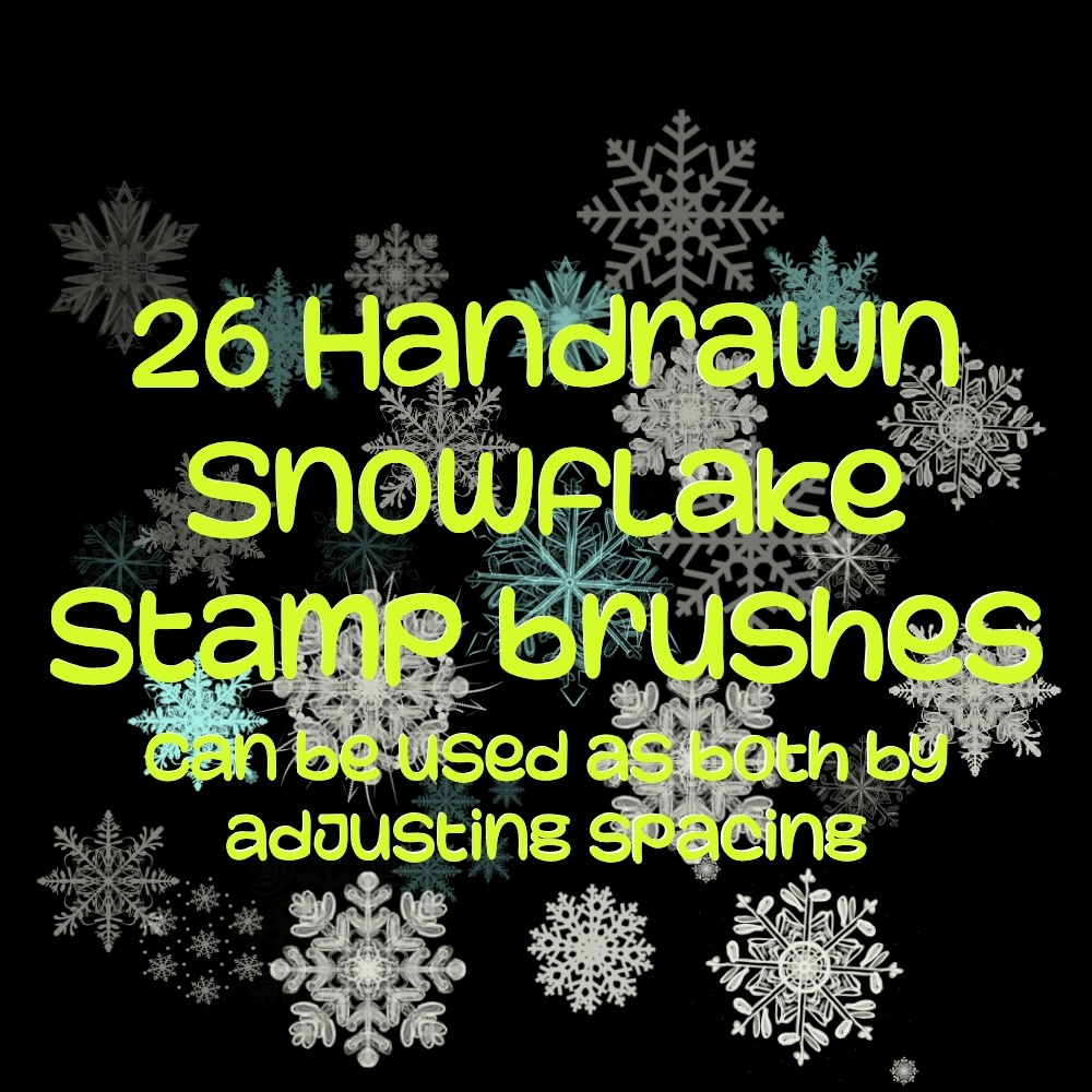 • 26 hand drawn snowflake stamp brushes simply adjust the spacing to determine if you want them to flow or stamp .